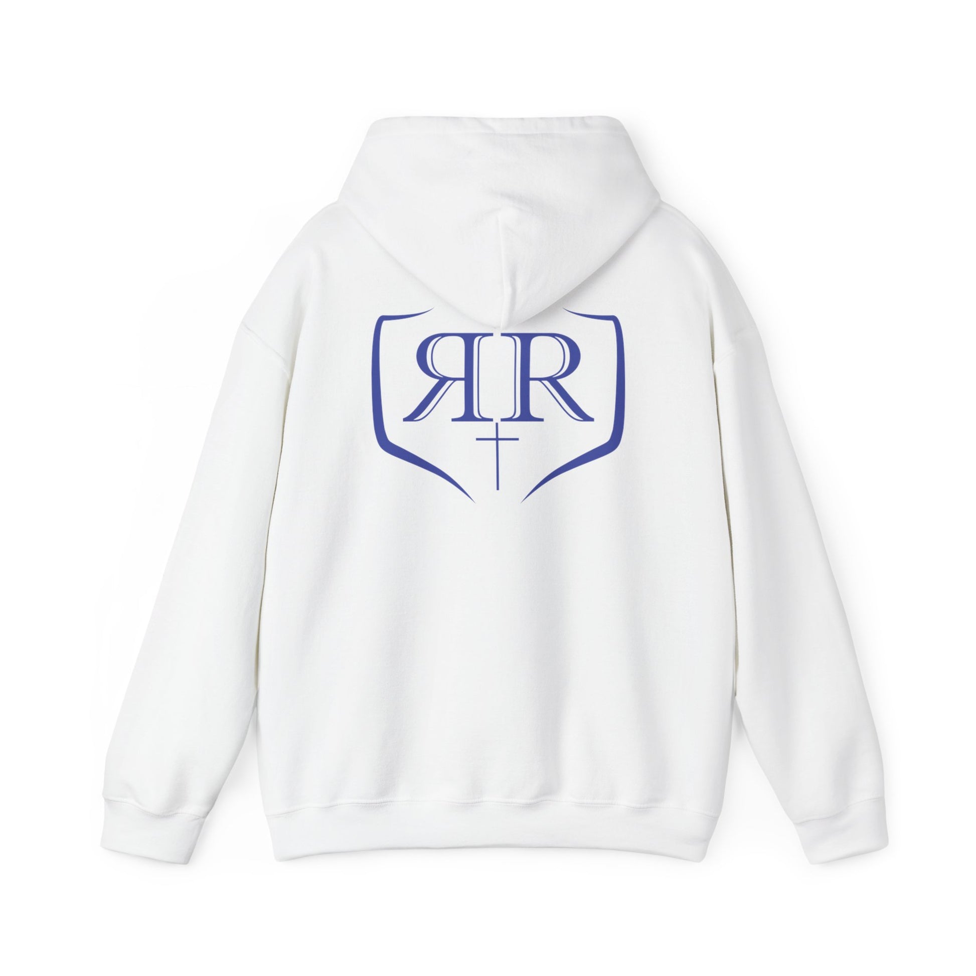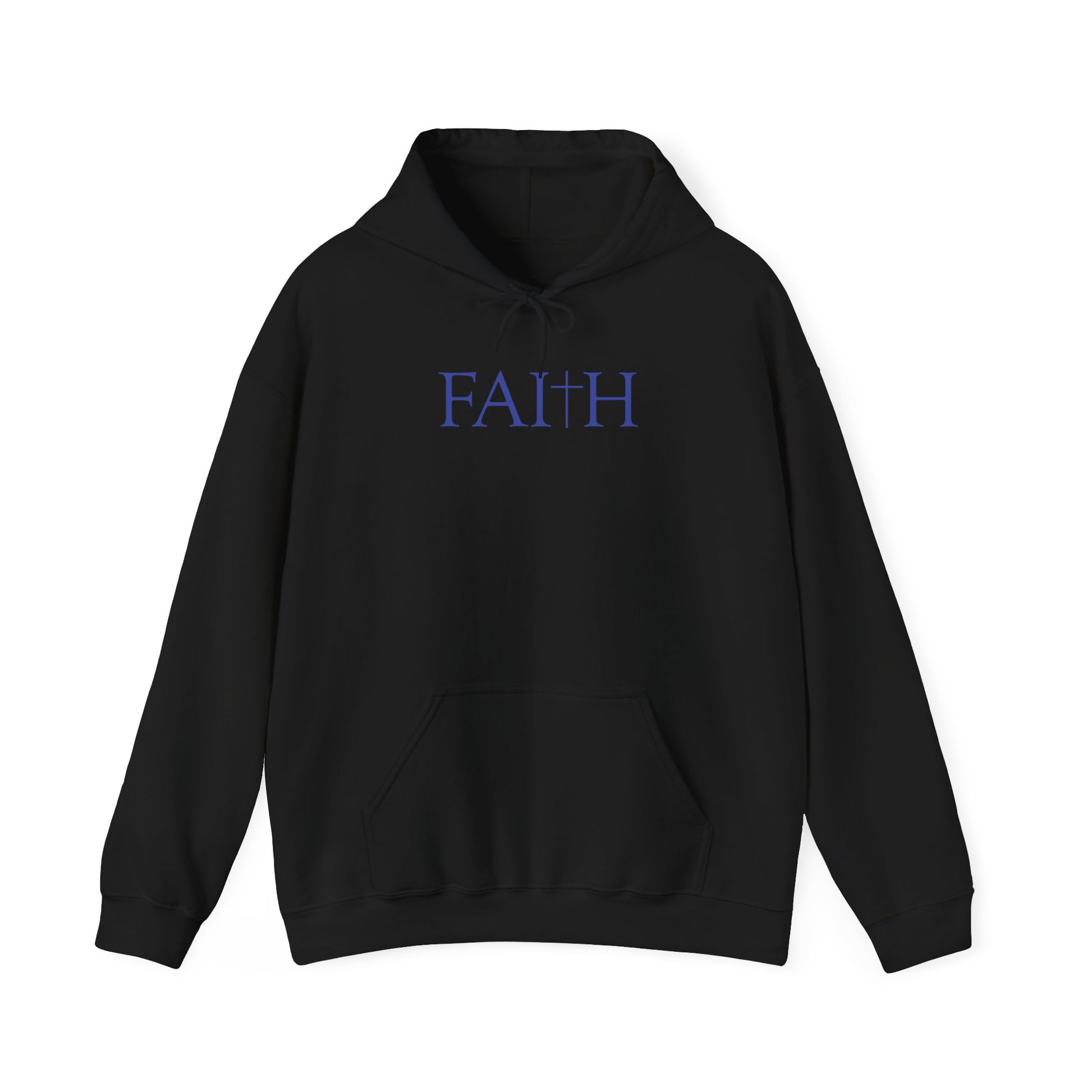 This minimalist white hoodie features a soft blue FAITH design with a cross subtly integrated into the typography — a clean, modern declaration of what your life is built on.