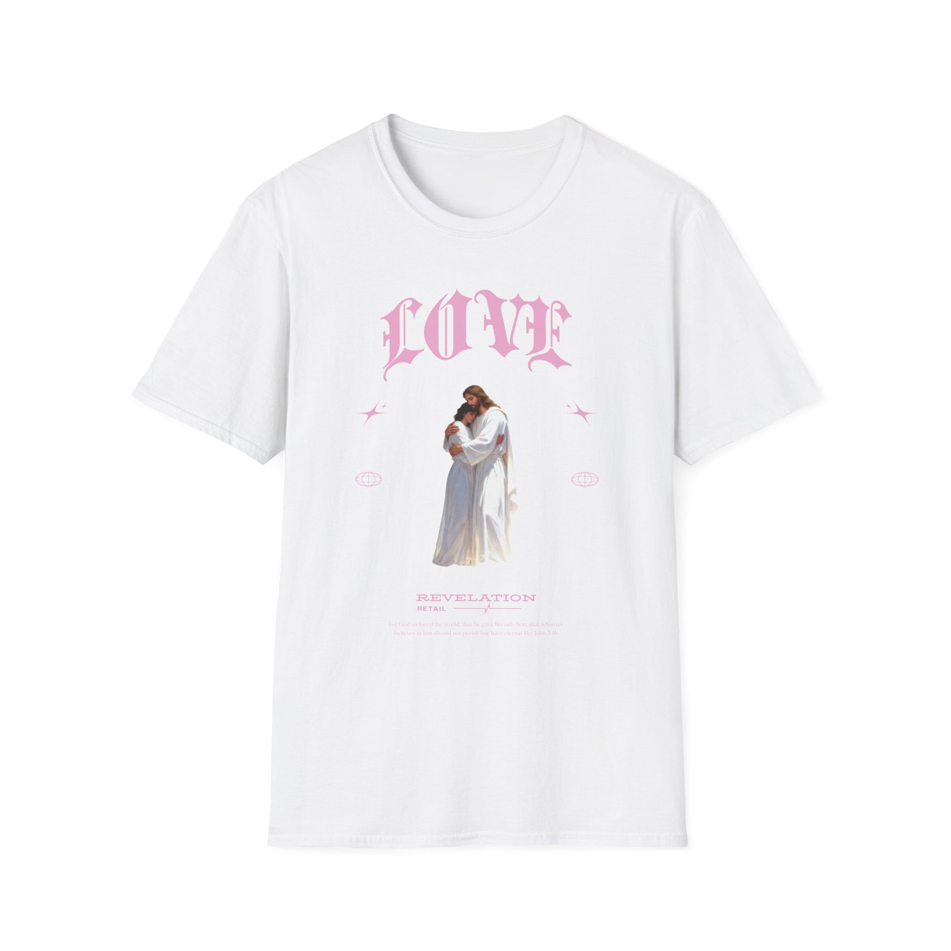 This soft white tee features Jesus embracing a child — a reminder of the Father’s heart: close, comforting, unconditional. The soft pink gothic text blends modern design with eternal truth