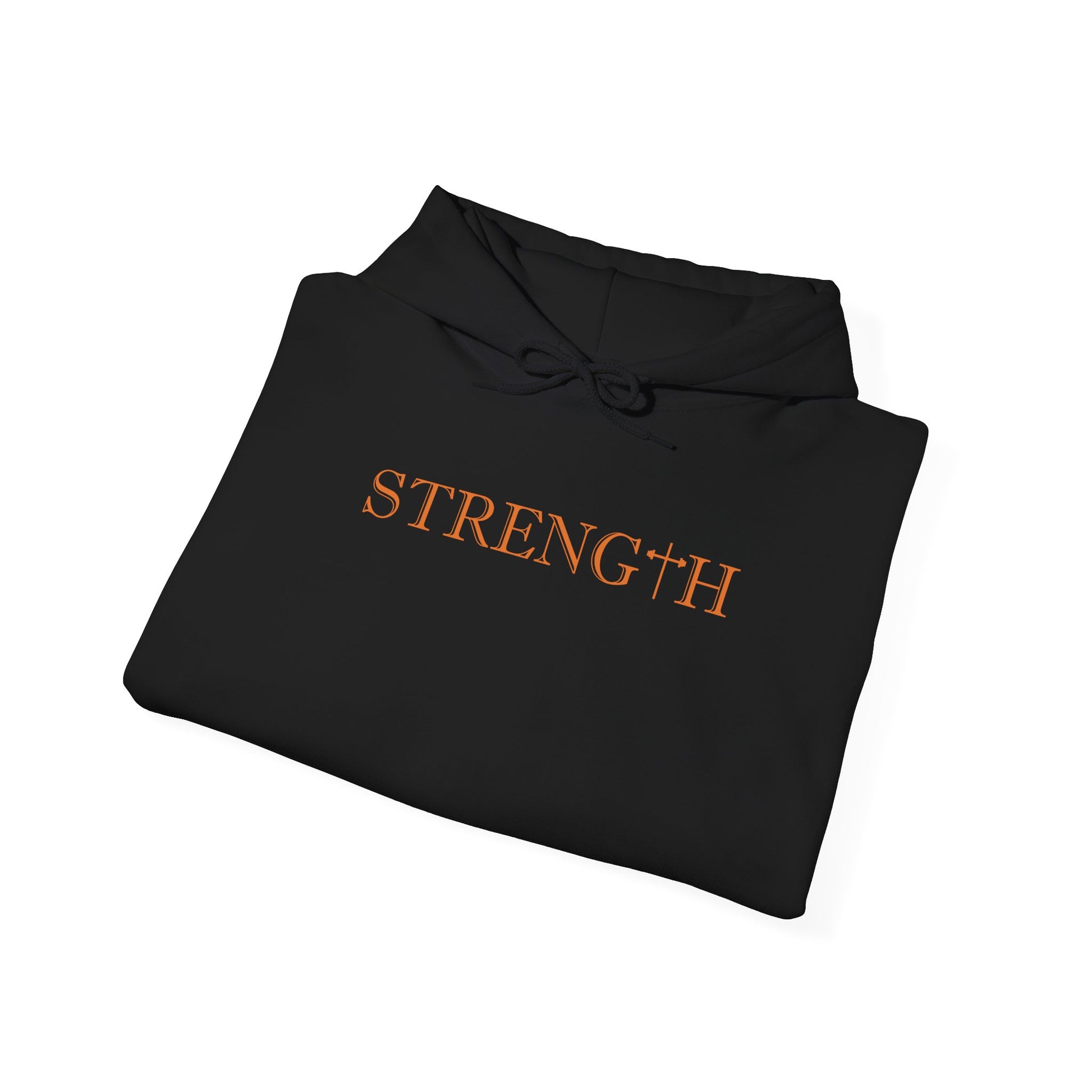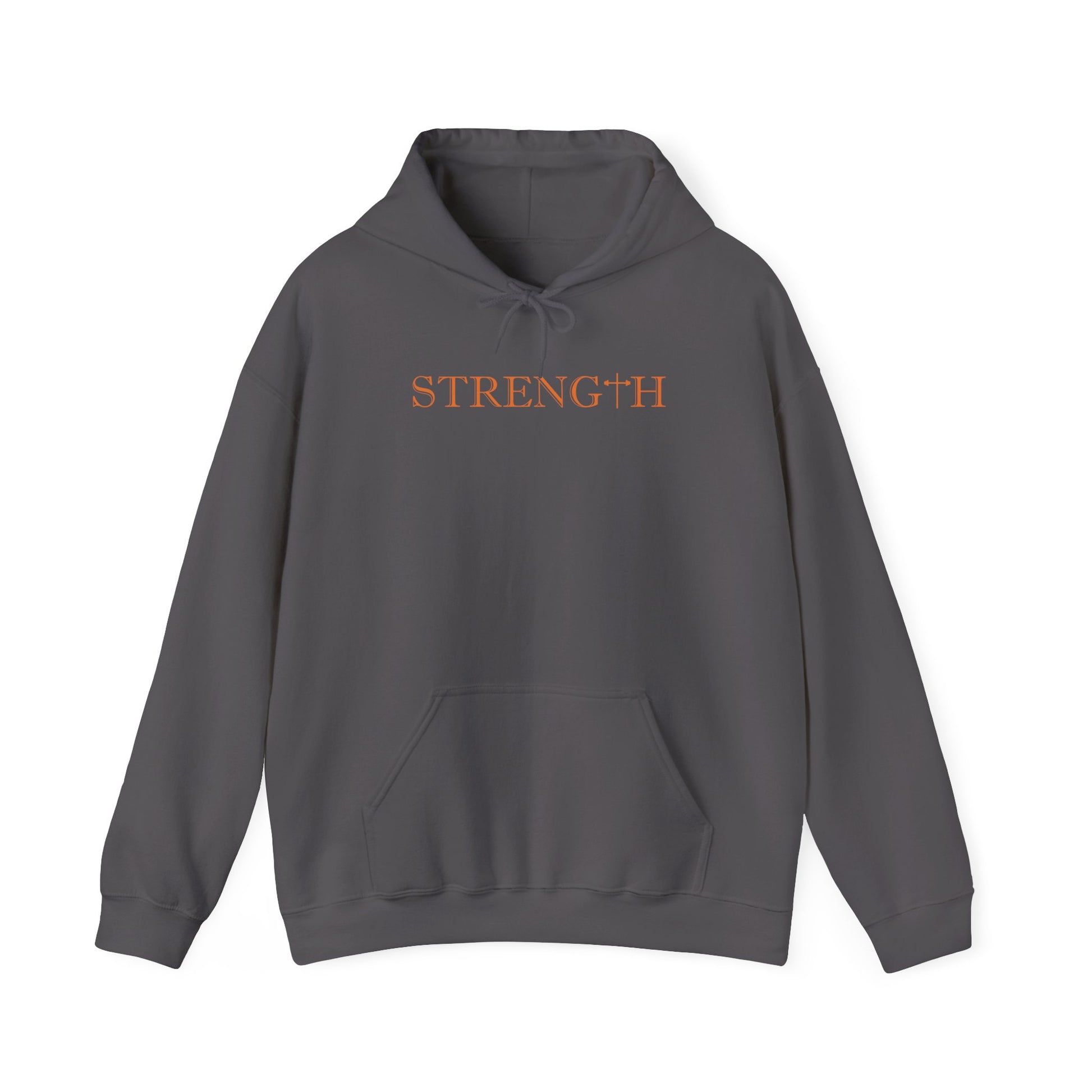 This hoodie features minimalist orange STRENGTH lettering with a cross integrated into the design — a subtle but powerful declaration of where your strength comes from.
